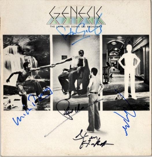 That's it. Genesis' most ambitious work to date that ultimately led to the shock departure of their much loved singer Peter Gabriel. This record was meant to be the< blockbuster that elevated the band to mega star status. However, it was based on such a complicated, demanding story line developed independently by Peter Gabriel, that in the short term it proved hard for audiences to understand and accept and caused friction within the group. Gabriel's comic fantasy stories that had endeared him to fans lost their appeal when taken too seriously and spread over four sides of an album. But nevertheless the work became the basis of an impressive stage show. Peter produced some of the most bizarre costumes for 'The lamb' show, including the lumpen and misshapen 'Slipperman', and weird looking 'Lamia'.The band illustrated the story with Peter as the main character 'Rael' and three projection screens..