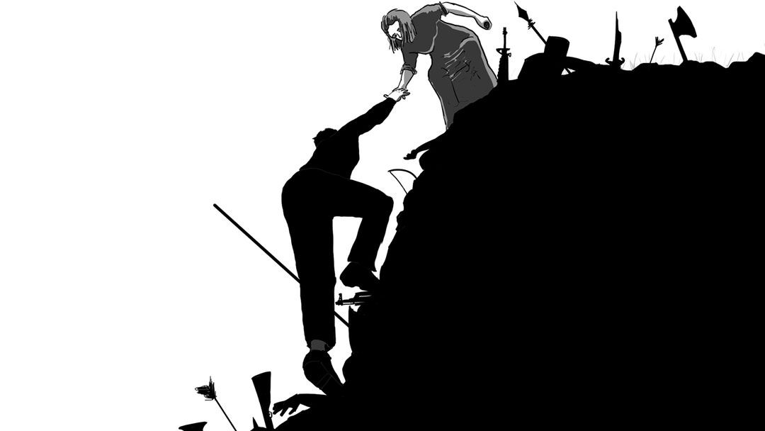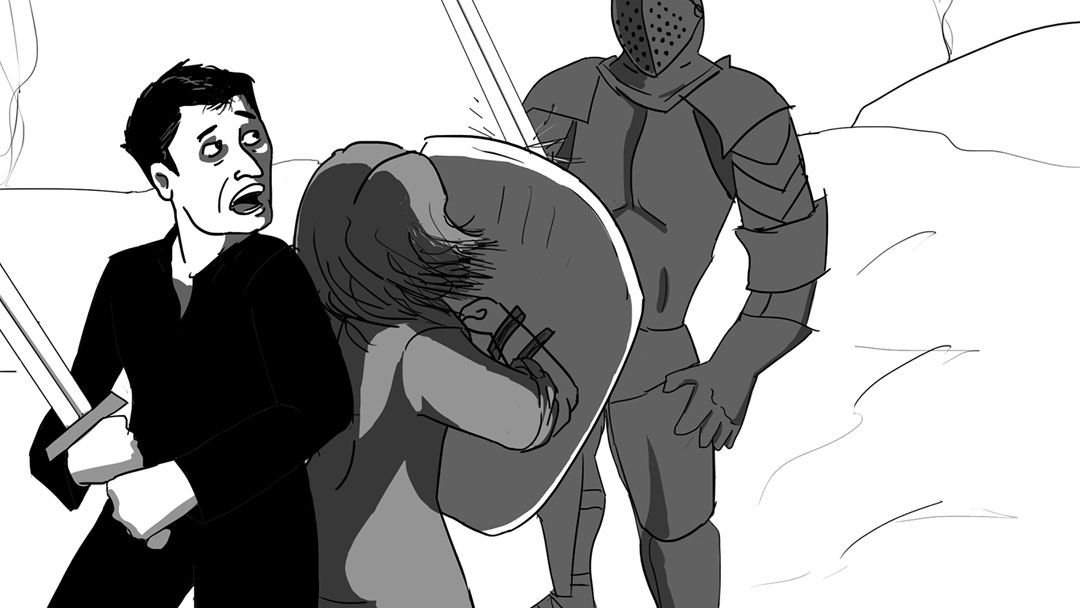 During the instrumental, we find the POV in the midst of the battle armed but noticeably out of place. As an attempt at making their journey more of a partnership than a hero/damsel scenario, I give the female a moment to show her courage when faced against an adversary. Equality is a fundamental cornerstone of a healthy relationship, and the physical endurance the POV have throughout the song is directly linked to their spiritual strength. I also thought it was funny to have her knock out a knight in full armor with just one punch, before the two of them make themselves scarce as reinforcements arrive. They survive the ordeal of the battle, and take their chance to escape the GESM's grasp.