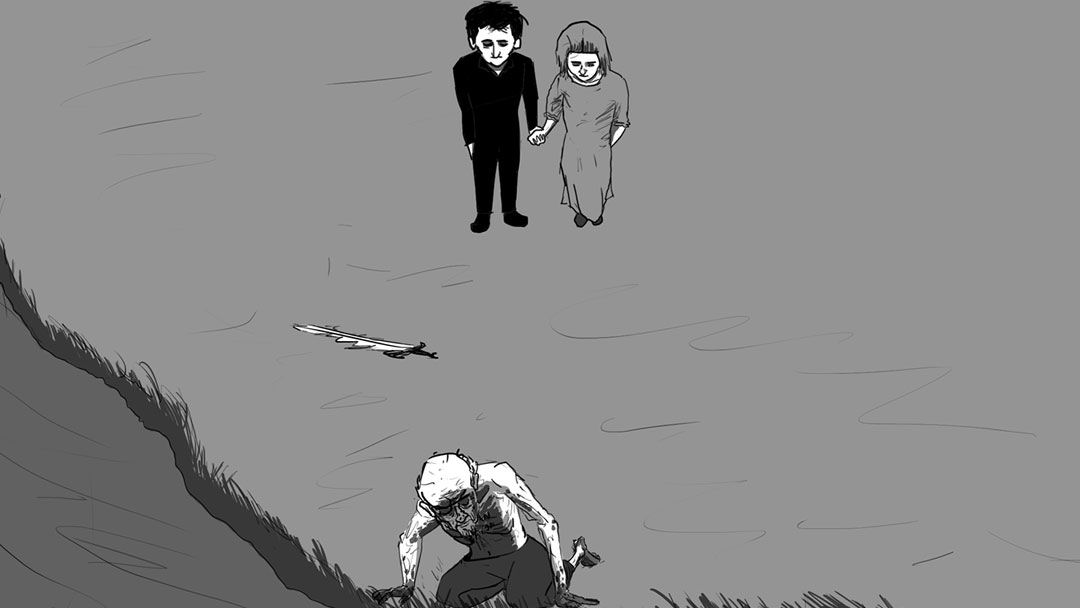 While the town celebrates, we transition back to the bloodied battlefield to find the POV quietly surveying the wake of the wreckage. A literal "mountain of human flesh" leads them to a "plateau of green grass, and green trees full of life." Its imagery is very straightforward, and I tried to keep faithful to this through my illustrations.