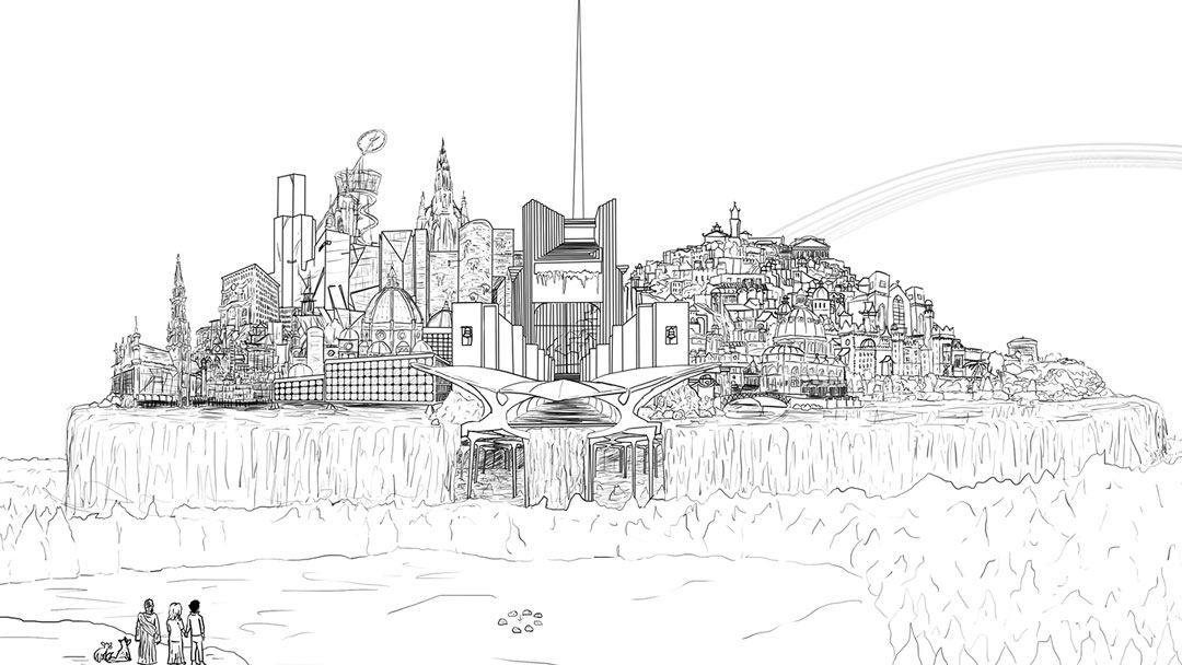 In this final grand image, my training as an architect comes through to imagine what the New Jerusalem may look like. Similar to our world's Jerusalem, this one has an old and new city (right to left, like Hebrew text), but among each are landmarks that transcend their time through the beauty of tectonic form. I built it around 26 different architectural elements that have had a professional and personal influence on my life and work. Some are monuments that one may easily recognize, while others are so personal that I doubt almost anyone would identify it. Heaven/paradise/nirvana/whatever you wish to call it is a reflection of the individual's mind, and since the POV are my creation (as I drew them), they share my vision.
