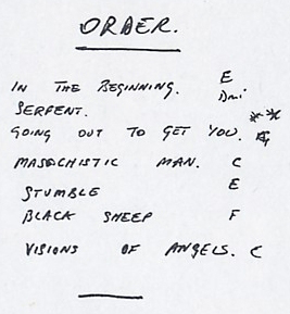 This is most instructive, for it reveals where the band were standing at this crucial moment in their history, shortly after a euphoria-filled creative summer and the decision to go pro after the Jonathan King disaster and shortly before the intense period at the Macphail’s cottage in the winter of 1969/70 that would shape the band to a band with their own sound and make them into a live act to be reckoned with. Which of the more than 50 songs made it into the first live set? What old songs did the band discard, which new songs did they consider good enough to play live? Peter Gabriel’s handwritten notes give us a glimpse into the musical world of Genesis as of October 1969. There is a shortlist of songs on the left side of the sheet, while on the right we find what was probably the set list of the night.